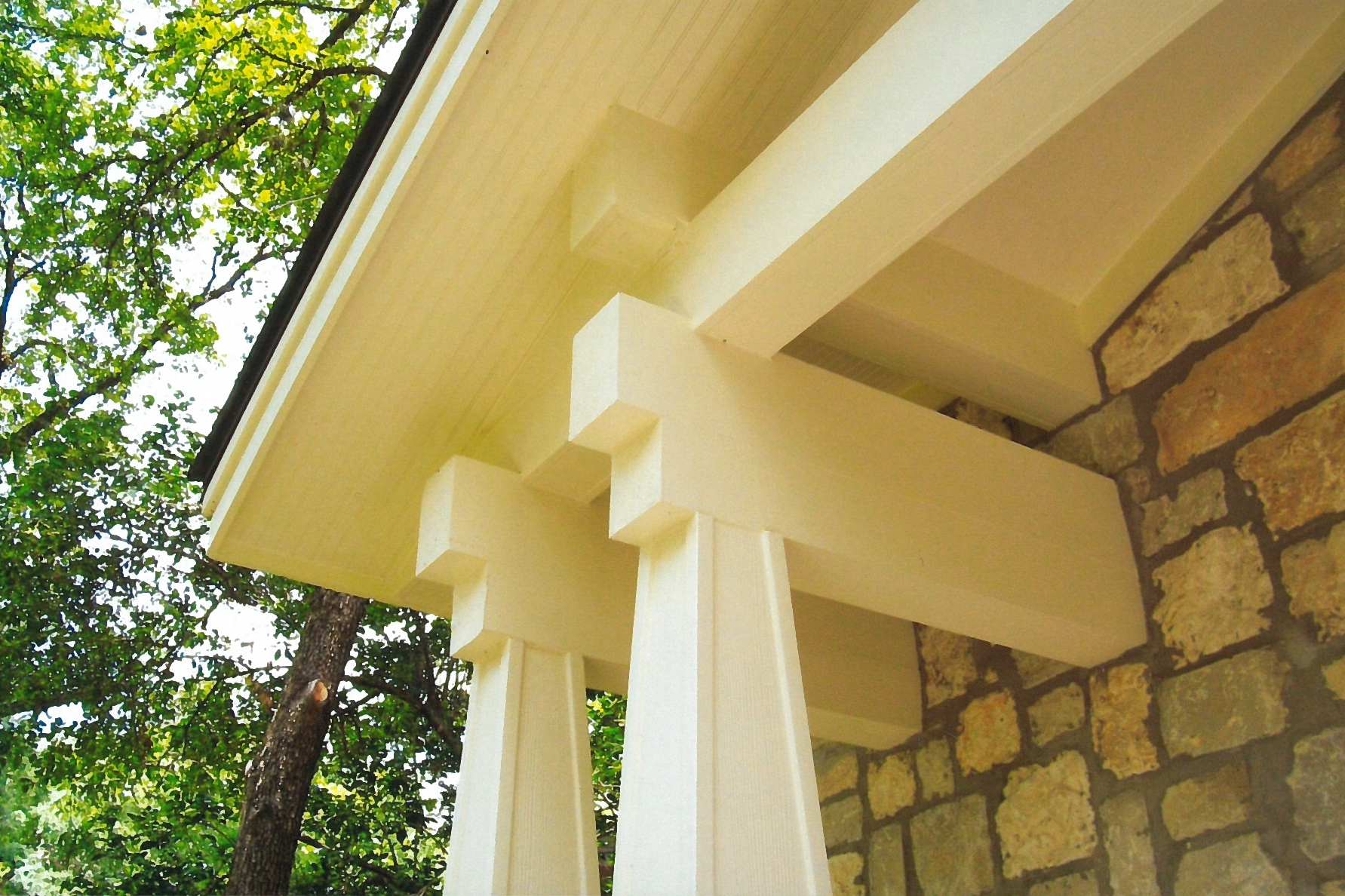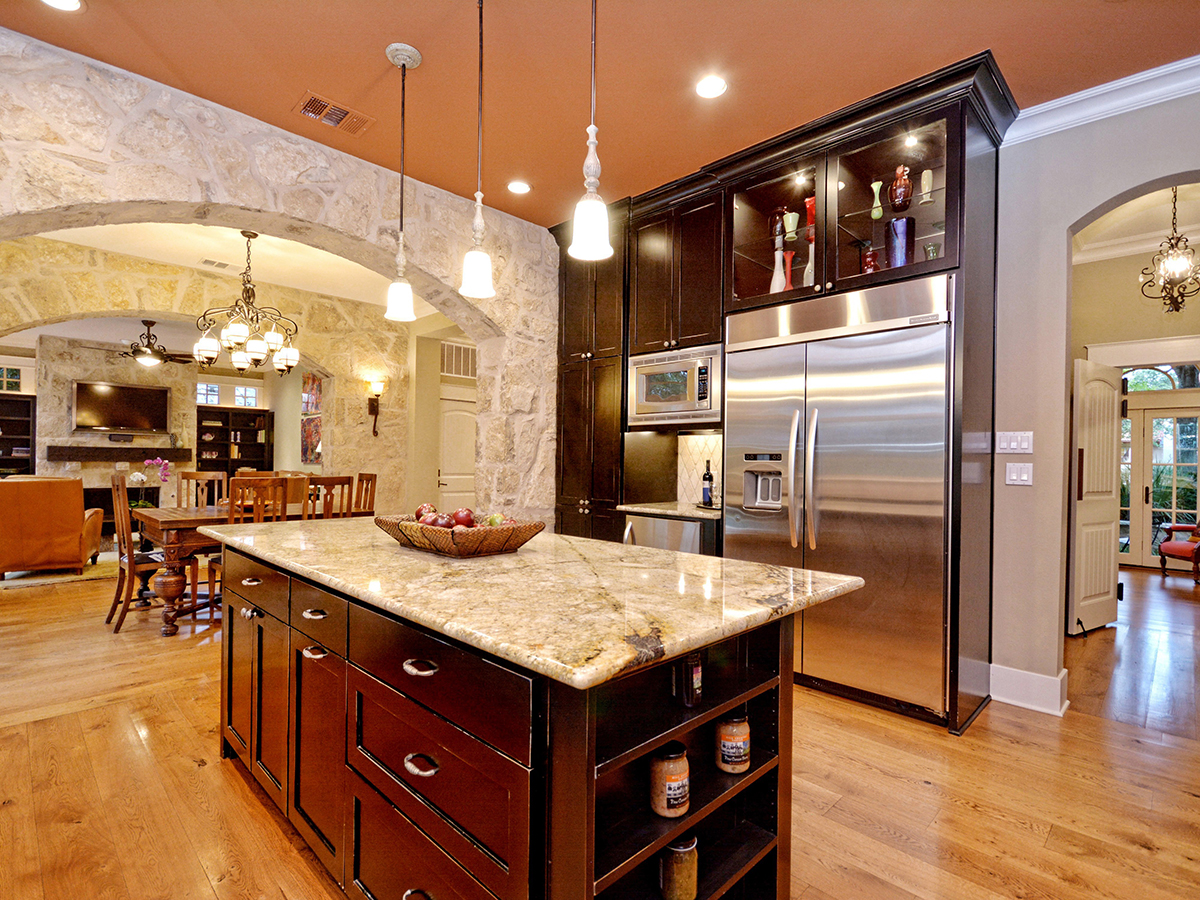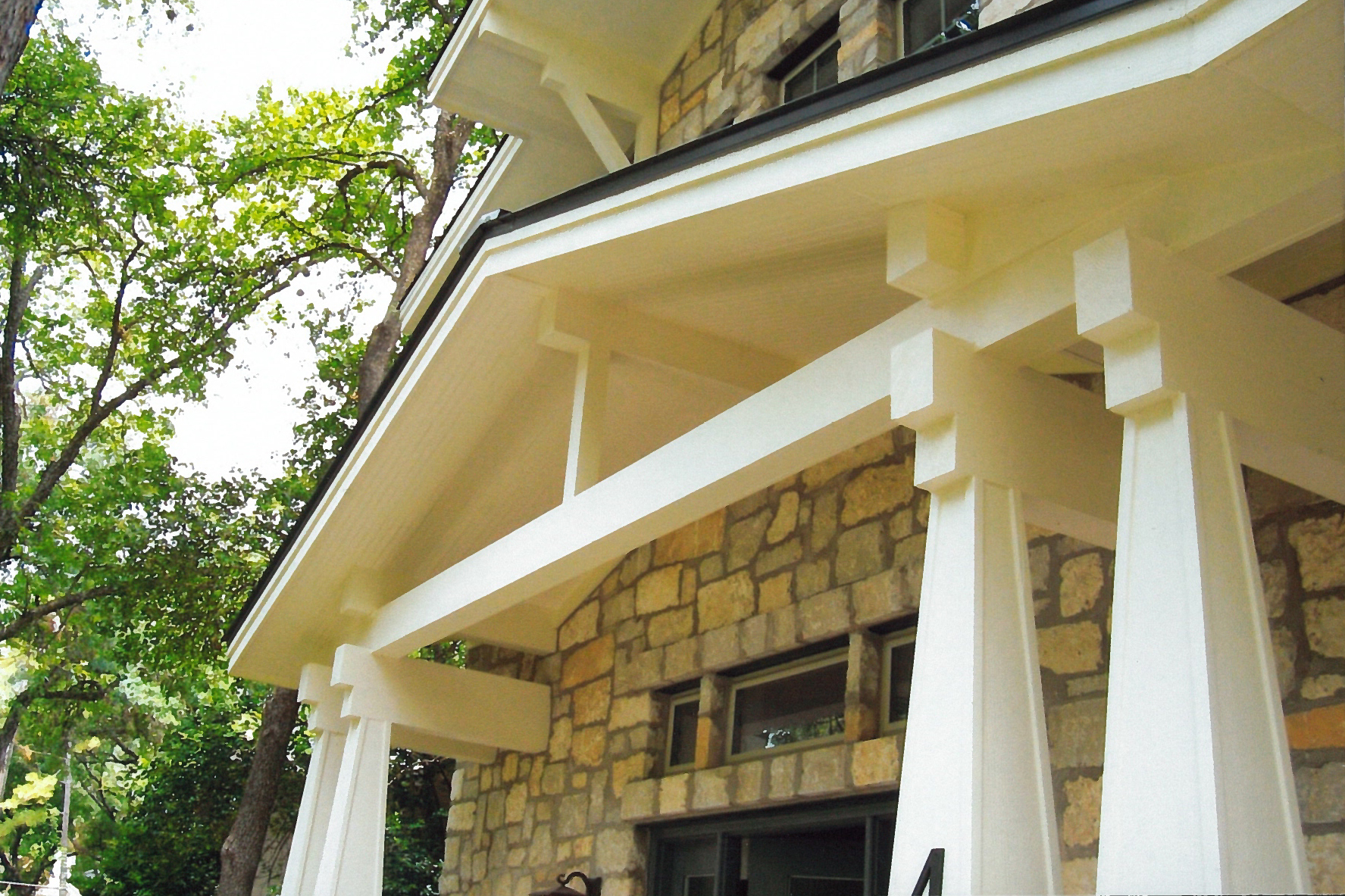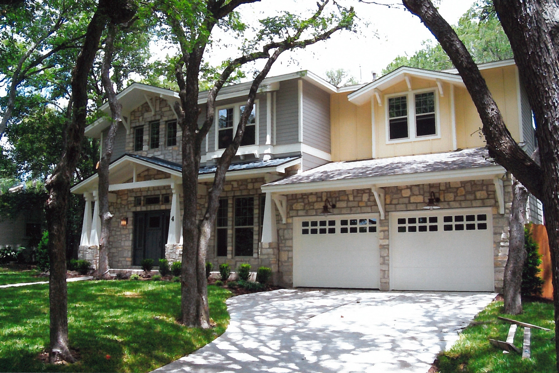 This was a speculative home that I designed and built in 2006. I tore down an old rundown home to get the lot, which is quite near Tarrytown Park. I remember that this was the first house where I used glass tile for the backsplash. I worked hard to save as many of the beautiful old Elm trees as possible; I also worked hard to get a perfect color of yellow to go with the rock. I particularly like the bungalow feel of this house with the soffit brackets and tapered columns. This was built back before we started seeing McMansions in Tarrytown.