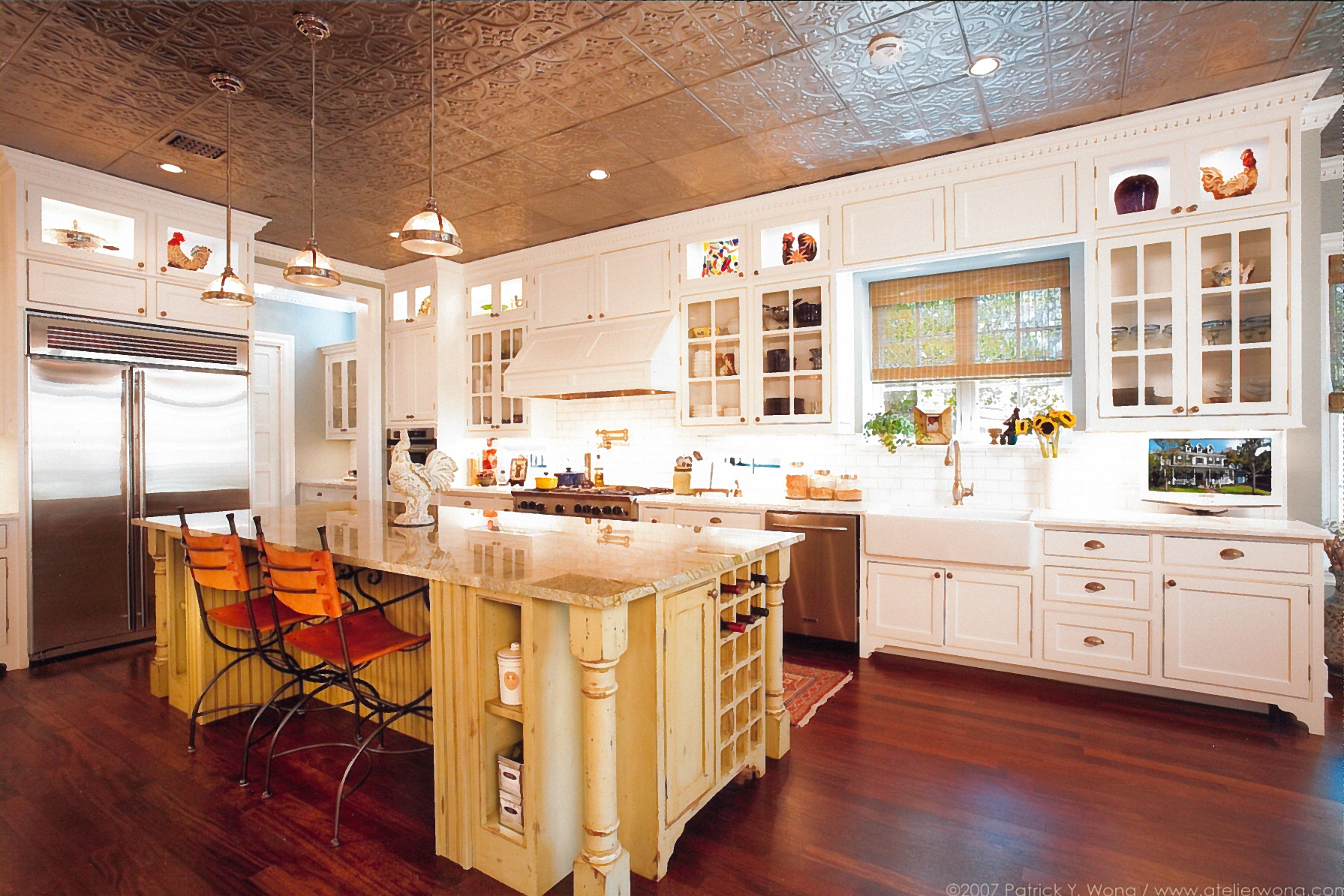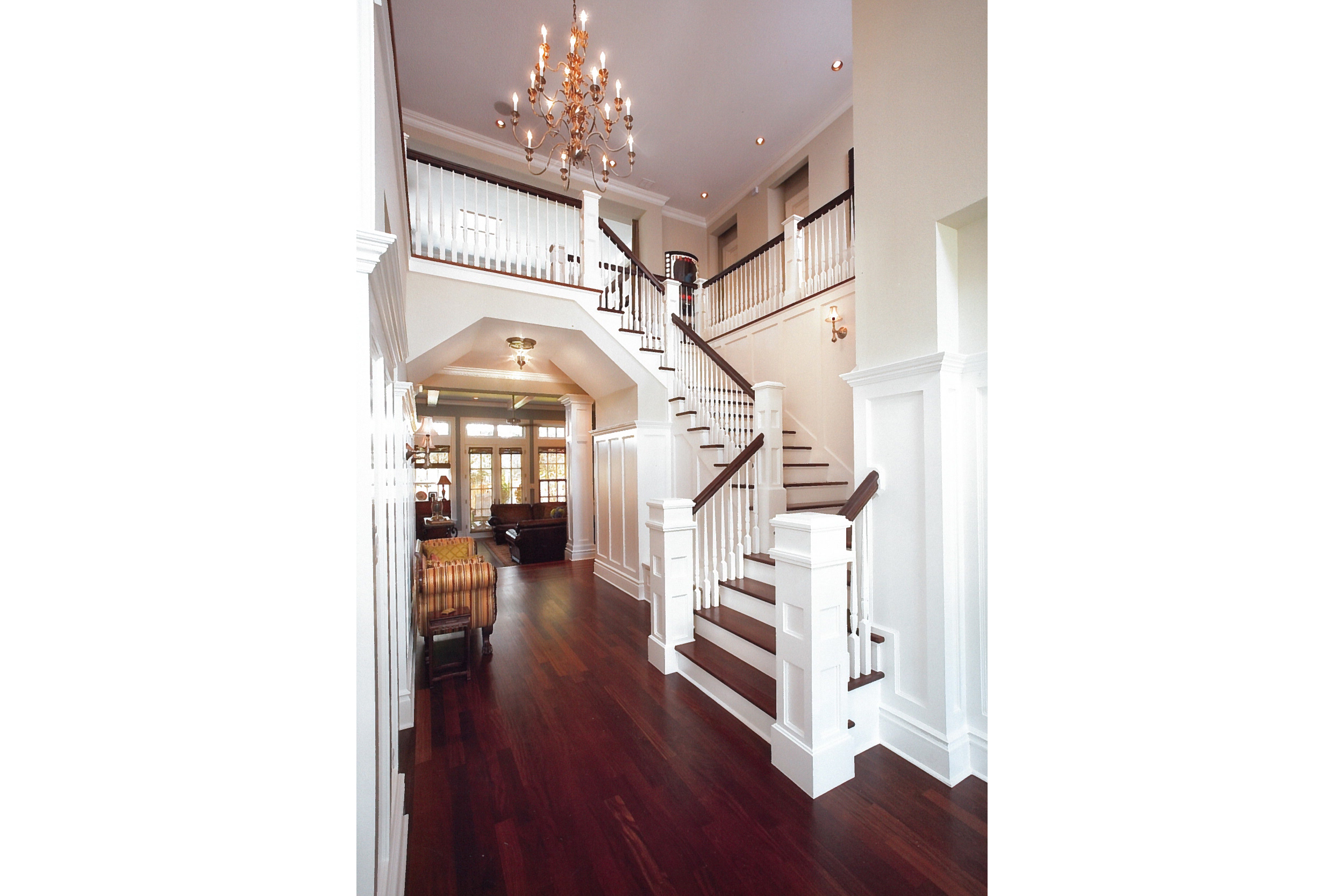 This was a very large and complicated custom home that required nearly a year to design and almost another year to build, and was completed in 2007. The owners did not want to work with an interior designer, so the three of us collaborated to design all of the aspects of this home. We had an excellent trim carpenter who was very creative and you can get a good look at his work in the photo of the custom stairs and paneling. Some other notable unique features included custom milled baseboards, custom aluminum celling tile in both the kitchen and breakfast area, gas porch lamps, and a front porch set over a slab base, to give it that old-time front porch feeling.