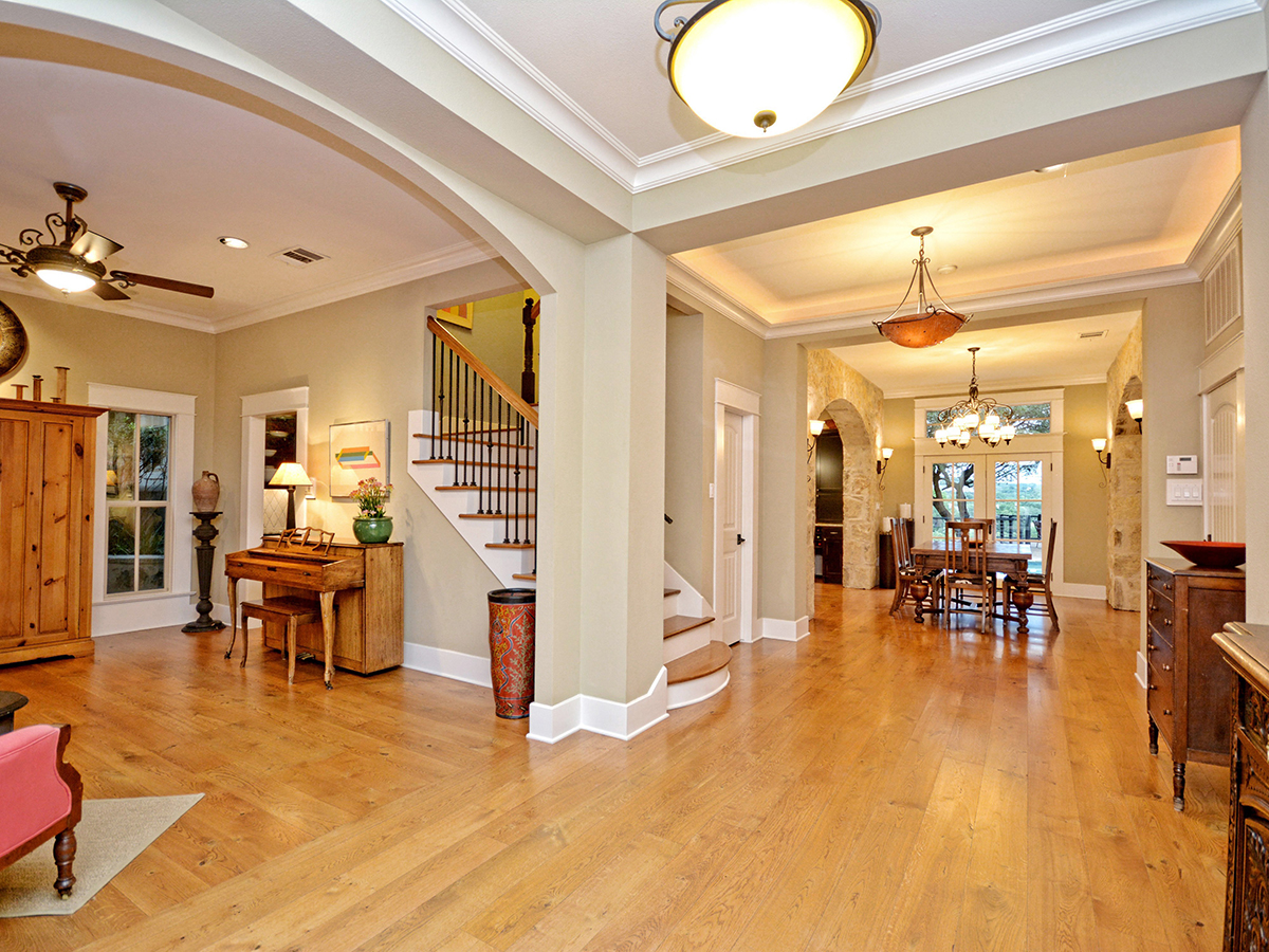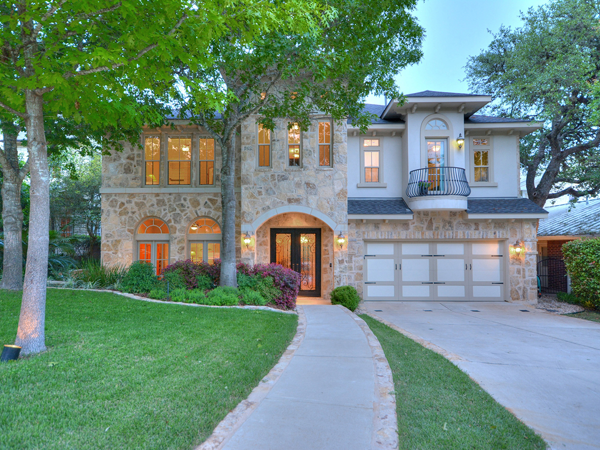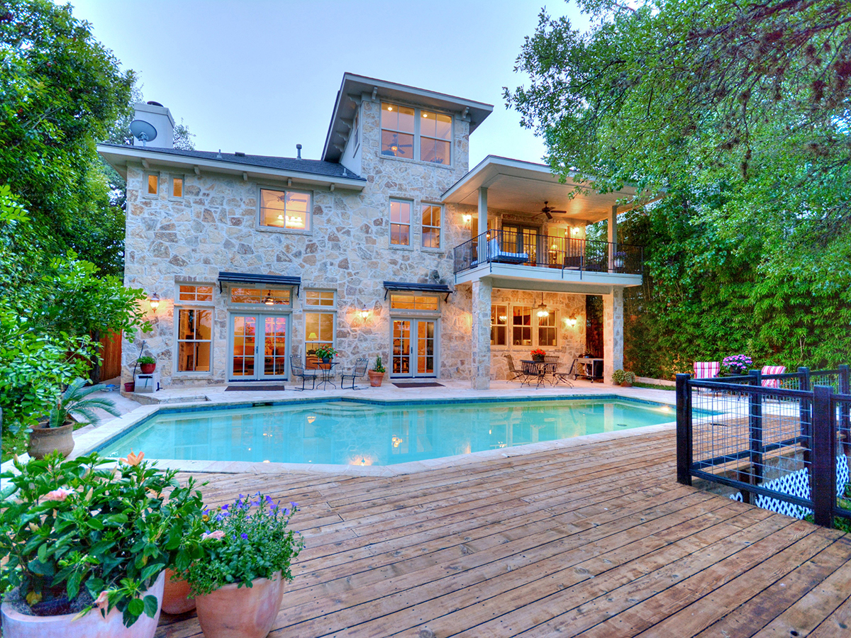 This is a home that I built for me and my family in 2009. I purchased the home next door, which we had built in the 1990’s, and this vacant lot had been their yard and pool area. I had to buy the property as as a package (the house and extra lot). I then resold the home and kept the lot. The new home needed to fit between the front set back line, and existing pool. I also wanted the back of the house to be level with the pool, so that there were no steps going out of the back doors. We cut the lot about three feet on the left front corner and added a lovely wall that adds dimension and interest. Since the lot had a small “footprint” we went up instead of out. There is a third floor game room and full bath. This lot also had potential for an amazing view, which at the time was covered up by overgrown landscaping. But I knew the view was there! And as an extra plus, the previous owners had built a path down to the water where we could keep our kayaks for paddling on Lake Austin.